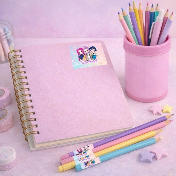 Planchas de etiquetas escolares adhesivas, ideales para quienes buscan una opción más económica para identificar útiles, cuadernos o materiales.